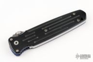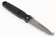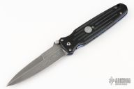 This Applegate Fairbairn Covert Auto by Butch Vallotton features a Damascus spear point blade with false top edge, dual thumb studs. The handle has milled black G-10 scales with a Damascus push button, anodized titanium liners and a stainless steel backspacer. "99 #C11" on the backspacer. Lanyard hole in pommel. Comes with a zippered case. Has a couple very light scratches, otherwise excellent condition.