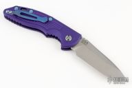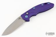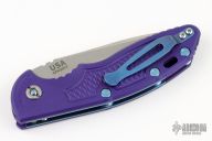 This XM-18 Flipper by Rick Hinderer Knives features a 3.5" stonewash finish blade, notched thumbrest and flipper.  The handle has a purple anodized aluminum frame with blue titanium hardware and matching tip up pocket clip. Comes with original box and papers. Excellent condition.