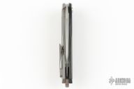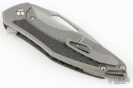 This Arius by Koenig knives features a brighwashed w/ PF finished blade with thumbhole and flipper. The handle has a smooth carbon fiber and bead blasted titanium frame, titanium tip up clip with hidden screws, and a titanium backspacer.  Raised carbon fiber inlay.   Has ceramic bearings and a ceramic detent ball. Nice detent, lockup and blade seating. Comes with original box and COA dated July 22, 2024. Excellent Condition.