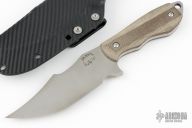 This fixed blade by Jason Stout and Jeremy Horton features a tumble finished chisel ground blade with .186" blade stock and 1.620" blade depth, full tang construction. The handle has OD micarta scales. Comes with a kydex sheath with belt loop, zipper case and COA. Excellent condition.