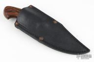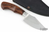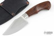 This Knife by Jan Hafinec features a bead blast finish clip point blade with sharpened top edge, .220" blade stock and 1.766" blade depth, hidden tang construction. The handle has a polished integral guard with a desert ironwood burl grip. Comes with a brown leather sheath. Excellent condition.
