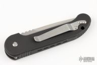 This LUDT side opening automatic by Marfione Custom Knives has a hand rub satin finished blade. The handle has a black anodized aluminum frame with a tip down stainless steel clip. Dated 12/99 and s/n 012. Comes with nylon sheath. Has some scratches on the clip, otherwise excellent condition.