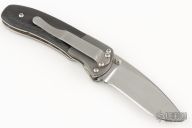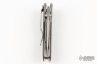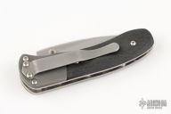 This Linerlock by Brad Duncan features a satin finished blade with dual thumbstuds. The handle has dovetailed titanium bolsters, carbon fiber scales, titanium liners, bead blasted stainless steel tip down clip. Nice detent, lockup and blade seating. Has scratches, has been resharpened, otherwise good user condition.