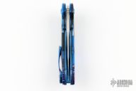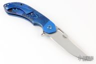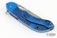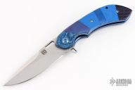 This Wayfarer Compact WC049 by Olamic Cutlery features a two tone blade with polished grinds, satin flats, swedge, thumb hole, notched thumb rest and flipper. The handle is comprised of "patchwork" construction of blue twill carbon fiber, anodized titanium, blue G10 and blue C-Tek over black fiber and anodized titanium liners and anodized titanium backspacer. Anodized titanium tip up clip is positioned for right hand carry. Includes padded and zippered case. Has some scratches, otherwise good condition.
