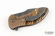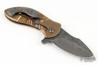 This custom Perepoon framelock flipper from Eric Ochs features an acid etched/tumble finished blade with flipper. The handle has an orange peel finished titanium frame that has been anodized to a bronze color, lockbar stabilizer and tip up zirconium clip and matching textured zirc backspacer. Nice detent, lockup and blade seating. Comes with nylon zippered case. Has some scratches, has been sharpened, otherwise good condition. dated 08/2016 inside backspacer.