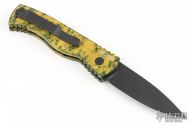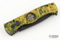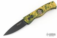 This TR-2 is a prototype with the Shaw sterling silver Zombie and splash anodized finished. Black blade. Strong action. Excellent condition. Comes with nylon belt sheath.