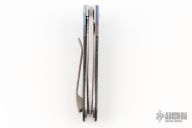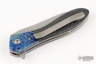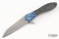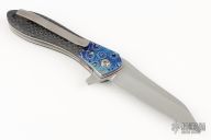 This Mini Thylacine Flipper by KC Gray Handmade Knives features a satin finished clip point blade with flipper. The handle is comprised of timascus bolsters and aluminum lightning strike carbon fiber scales over orange peeled titanium liners and barrel spacers. Orange peeled titanium tip up clip. Nice detent, lockup, action and blade seating. Comes with nylon zippered case and COA dated 5-17. Has a couple light scratches, otherwise excellent condition.