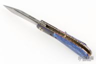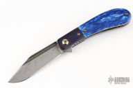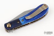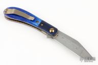This Backpocket flipper from Doc Shiffer features a 1095 blade with hamon, fuller, notched thumbrest and flipper. The handle has NitreBlue Damascus bolsters, giraffe bone scales with red liners, fileworked and anodized titanium liners, tip up anodized titanium clip. The blade is centered when closed and locks up with no play, nice detent. Has a couple light scratches, has some oxidation spots on the blade, otherwise good user condition. Comes with COA dated 2-13-18