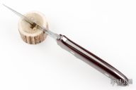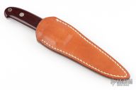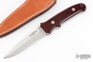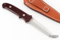 This New York Special by Takayuki Watanabe features a mirror polished blade with sharpened top edge, .183" blade stock and .936" blade depth, full tapered tang construction. The handle has maroon linen micarta scales. Comes with a brown leather sheath. Has a few light spots on the blade, otherwise excellent condition.