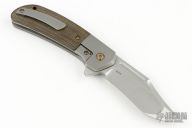 These X-Series knives from Enrique Pena/Reate Knives feature two-tone finished, S35VN blades with stonewashed grinds and satin finished flats. The bolsters/liners feature a fine bead blasted finish with green canvas micarta  scales and anodized hardware. Blade is centered when closed, flips well with no wrist action needed, and locks up with no blade play. Has some scuffs, otherwise excellent condition.