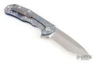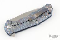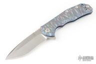 This knife by Kizer features a satin finished blade with notched thumbrest and a flipper. The handle has an anodized sculpted titanium frame with a tip down titanium clip, polished barrel spacers and lanyard hole. Excellent condition.