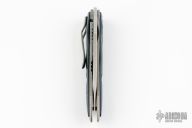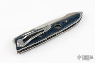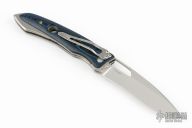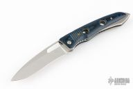 This Deryk Munroe Chimera features a tumble finished Talonite blade with thumb hole and notched thumbrest. The handle has black/blue G-10 scales with tumbled titanium liners and a matching tip down pocket clip. Nice detent and blade seating is center. has some scuffs and scratches, especially on the clip, also has some minor vertical blade play, otherwise good condition.