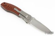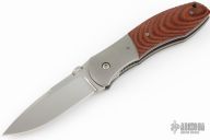 This RG-2 linerlock folder by John W Smith features a hand-rubbed satin finish blade, blasted titanium dovetailed bolsters, and micarta scales. Tip down bead blasted stainless clip. Notches on thumbrest, rear of handle, and lockup. Smooth action with a nice detent. Nice detent, blade seating and lockup. Excellent condition.