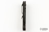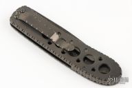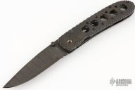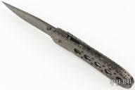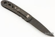 This Leopard Folder by Pat and Wes Crawford features a black finished drop point Damascus blade with single thumbstud. The handle is comprised of a black satin titanium frame over a single titanium liner and steel backspacer, tip down black satin stainless steel clip. Comes with a nylon velcro belt sheath. Has some light scratches, excellent condition otherwise.
