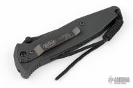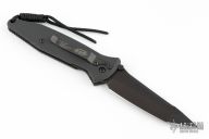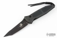 This Socom D/A tactical side-opening automatic by Microtech has a black coated tanto plain edge blade. Dated 5/2000; S/N 021. Has a black aluminum handle with rubber inserts, all hardware including clip is matte black. Strong action and perfect lockup. Comes with original box, papers, and belt sheath. Has a couple light scuffs on the frame, excellent condition otherwise.
