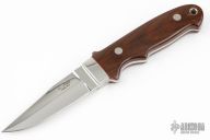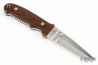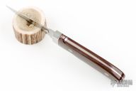 This New York Special by Chad Nell features a mirror polished double-edged blade with .132" blade stock and .883" blade depth, full tapered tang construction. The handle has stainless steel bolsters, brown canvas micarta scales with red liners. Has a couple light scratches, otherwise excellent condition.