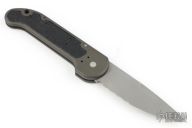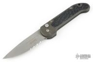 This LUDT side opening automatic by Microtech Knives has a bead blasted partially serrated blade. The handle has a black anodized aluminum frame, THE INSERTS HAVE BEEN REMOVED and replaced with black exotic leather. Dated 10/96. Has a some scratches and scuffs, has been resharpened, otherwise good user condition. Comes with MT nylon sheath.