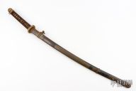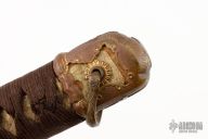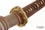 This is antique katana has a satin finished blade with .259" blade stock and 1.238" blade depth, hidden tang construction. The handle has a brass tsuba, seppas, silver habiki, handle and saya. Has some wear, some light scratches and patina, otherwise good condition for its age. This is believed to have been made prior to WWII as an officers sword.