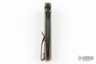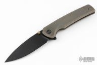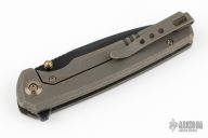 This knife features a tumbled black blade with a notched thumbrest with dual thumbstuds. The handle has a tumbled titanium frame with a matching tip up pocket clip with a matching tip up pocket clip. Comes in a clasped, hard case. Excellent Condition.