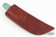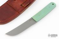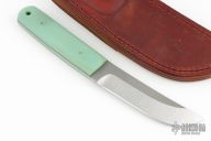 This Tanto by Farid Mehr features a bead blasted chisel ground blade with .129" blade stock and 1.141" blade depth, full tang construction. The handle has jade G-10 scales with a lanyard hole at the butt. Comes with a brown leather sheath. New from maker.
