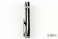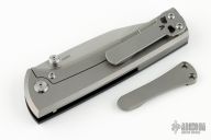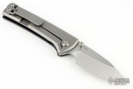 This Chaves Scapegoat features a satin finished drop point blade with the Chaves logo and dual thumbstuds. The handle is composed of black G-10 and stonewashed titanium with a matching tip up titanium pocket clip. Comes with original box and extra clip. Excellent condition.