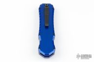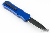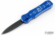 This Excalibur OTF from Piranha Knives features a black double edge blade with fuller. The handle is comprised of blue anodized aluminium with a black tip down clip. Includes original packaging and paperwork and pouch. Excellent condition.