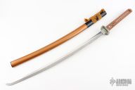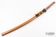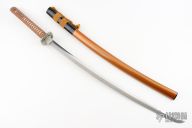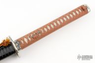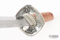 The theme carries throughout this katana in almost every aspect. The silver tsuba, fuchi, fuchi-kashira feature the dragon, cloud and lightning motif. Even the 27 7/8” blade reflects the torrent with the gunome-midare hamon style. The golden saya, brown sageo and handle wrap contrast beautifully against the silver furniture. The black carved wood, buffalo horn kurikata and kojiri on the golden saya give the katana even deeper depth. The hardest decision you will have to make is whether or not to keep it as a collectible or as a functional sword in your armory.