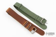 We love Neightoe Straps! No tools needed, durable, and easily customizable. Our watches utilize a standard 20MM strap. Each watch ships with two straps. It ship with brown Horween leather and green nylon.