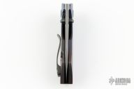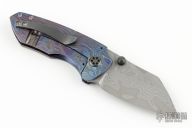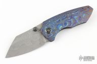 This Full Dress Critter by Matthew Christensen features an Armorcore low layer wave pool pattern San-Mai Damascus blade with a false top edge and dual zirconium thumbstuds. The handle has a satin finished subdued lava pattern DarkTi frame complimented with blasted Zirconium tip up pocket clip, pivot, and backspacer.  Includes a Dragoncut knife pouch and COA, dated Sept 2024. New from maker!