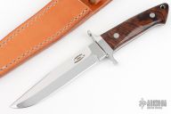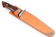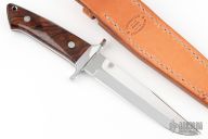 This Loveless style Fighter from James Sponaugle features a mirror polished blade with a sharpened top edge, .182" blade stock and 1.141" blade depth, full tapered tang construction. The handle has a mirror polished stainless steel guard, ironwood scales with red liners and spacers, lanyard hole at the butt. It comes in a custom brown leather sheath. New from maker.