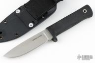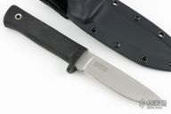 The spine of the blade is a full .186" thick to allow for the necessary strength and stiffness to field dress and skin the biggest animals like elk, moose, brown bear, and the African Dangerous Seven. The grip is specially designed to promote long use without fatigue. Made of the shock absorbent, slightly tacky feeling Kraton, and featuring our deeply checkered surface, it positively won't slip no matter how wet or bloody your hands get. Plus, Kraton has specially enduring advantages in that it will never rot, shrink, crack, splinter, or mildew, and is completely impervious to even the harshest weather. Comes with original kydex sheath. Has some light scratches, has been sharpened, otherwise excellent condition for its age.