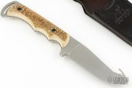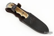This Freeman Guthook Skinner by Gerber features a satin finished blade with guthook and a notched thumbrest, .132" blade stock and 1.144" blade depth, full tang construction with stag scales. Coems with a black leather sheath, original box and papers. Excellent condition.