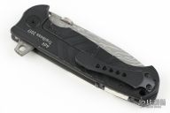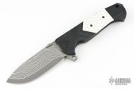 This Custom Trailboss from Andre De Villiers features a Damascus drop point blade with swedge, has a knurled stainless thumb disc and flipper. The handle is comprised of a black coated titanium frame with white C-Tek inlays over a matching backspacer with inlay, black titanium tip up clip. Great lock up, detent and blade seating. Includes padded and zippered ADV case. Has some scuffs on the frame, great condition otherwise.