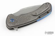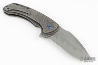This Fallout Flipper has a tanto blade with false top edge, nice hamon, and flipper. Handle is heavy tumbled titanium, with anodized titanium pivot and backspacer, and anodized and matching tip up clip. Nice detent, lockup and blade seating. Excellent condition. Comes with maker zipper case.