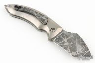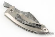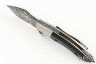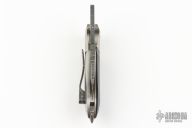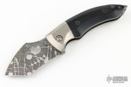 This friction folder by Twisted Bunnie Knives features an acid etched drop point blade with notched thumbrest and friction bar. The handle has titanium bolsters and liners, g10 scales, tip up acid etched clip. Excellent condition.