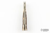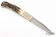 This stunning lockback folder from Jess Horn features a hand rubbed satin finished clip point blade with false top edge and nail nick. Satin finished nickel silver bolsters with beautiful stag scales, hand peened nickel silver pins, and nickel silver liners. Satin finished backspacer is stainless steel and black linen micarta, and butt of handle has lanyard hole. This beautiful piece is numbered #029. Has a couple light scuffs and scratches, excellent condition otherwise.