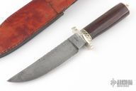 This Bowie by Billy Watson features a Damascus blade with fileworked spine, .314" blade stock and 1.414" blade depth, hidden tang construction. The handle has nickel silver guard and butt, brass and fileworked nickel silver collar, rosewood grip, brass tang nut. comes with a brown leather sheath. Has some light oxidation, otherwise excellent condition.