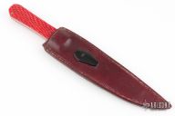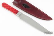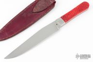 This bowie by "H" features a hand rub satin finished blade with false top edge, .124" blade stock and 1.334" blade depth, full tang construction. The handle has steel bolsters, red jigged bone scales with brass liners. Comes with a brown leather sheath. Excellent condition.