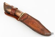 This knife by MULE features a polished blade with false top edge and fileworked thumbrest, .235" blade stock and 1.904" blade depth, hidden tang construction. The handle has a brass guard, crown stag grip with red/white/blue spacers. Comes with a hand tooled brown leather sheath. Has some patina and scratches, otherwise good condition.