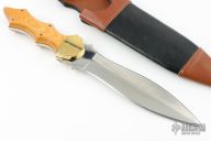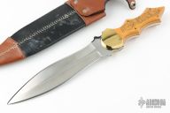 This Dagger by Jon Schulps features a satin finished double edged blade with mirror polished flats, .240" blade stock and 1.797" blade depth, full tang construction. The handle has brass bolsters, yellow Westinghouse paper micarta scales with stainless steel pins and black liners. Comes with a brown/black leather sheath. Has a couple light scratches, otherwise excellent condition. Scrimshaw is dated '86