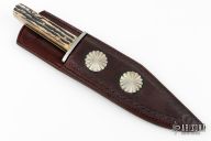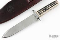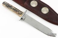 This bowie by Hansen Cutlery features a satin finished spear point blade with false top edge, .241" blade stock and 1.251" blade depth, full tang construction. The handle has a steel guard and jigged bone scales. Comes with a hand tooled brown leather sheath with nickel silver conchos on the front. Has some scratches and light patina, otherwise good condition.