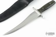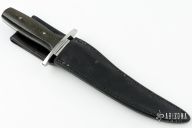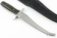 This fighter features a satin finished blade with false top edge, .211" blade stock and 1.496" blade depth, full tang construction. The handle has a stainless steel guard and black linen micarta scales. Comes with a black leather sheath. Has a couple light scratches, otherwise excellent condition.