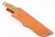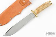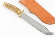 This Bowie features a satin finished blade with false top edge and fullers, .233" blade stock and 1.458" blade depth, hidden tang construction. The handle has a brass guard and butt and a stag grip. Comes with a brown leather sheath. Has some scratches and some light patina, otherwise good condition.