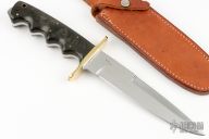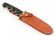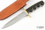 This SK2 Fighter by Enedino De Leon features a satin finish blade with a sharpened top edge, .205" blade stock and 1.289" blade depth, full tang construction. The handle has a brass guard, black canvas micarta scales with white liners. Includes a brown leather sheath. Excellent condition.