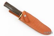 This JF Fighter by Enedino De Leon features a satin finish blade with a sharpened top edge, .212" blade stock and 1.3222" blade depth, hidden tang construction. The handle has a brass guard and butt, black linen micarta grip with black/red/brass spacers. Includes a brown leather sheath. Excellent condition.