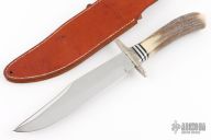 This Bowie by Bob Miller features a mirror polished bowie style blade with a false top edge, .155" blade stock and 1.540" blade depth, hidden tang construction. The handle has a textured nickel silver guard and a stag grip with black/aluminum spacers. Includes a brown leather sheath. Has a little scratches, otherwise excellent condition.