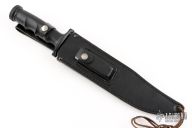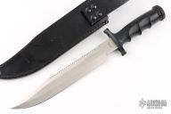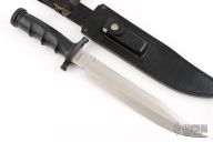 This knife by Valor features a satin finished blade with false top edge and sawteeth on the spine, .154" blade stock and 1.432" blade depth, hidden/hollow handle construction. The handle has a black aluminum grip with removable butt cap with compass and survival items in the handle. Comes with black leather sheath. Has some light scratches, otherwise excellent condition.