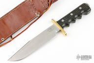 This fighter from Martin Knives features a satin finish clip point blade with sharpened top edge, .209" blade stock and 1.532" blade depth, full tang construction. The handle has a brass guard, black linen micarta handle with lanyard hole in pommel. Includes a brown leather sheath with a stone. Excellent condition.