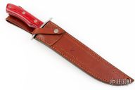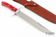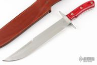 This Bowie by Katz features a satin finished blade with false top edge, .237" blade stock and 1.467" blade depth, full tang construction. The handle has a stainless steel guard with dymondwood scales. Comes with a brown leather sheath. Has some light patina and a nick on the false top edge, otherwise excellent condition.