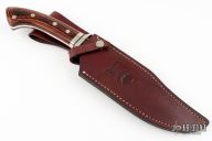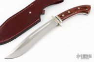 This Custom Grizzly Bowie by Tak Fukuta features a satin finished, recurved bowie style blade with swedge and fullers, .258" blade stock and 1.625" blade depth, hidden/frame tang construction. The handle has a nickel silver guard with nickel silver and red and black fiber spacers, dymondwood scales with nickel silver pins and lanyard tube in pommel. Includes a brown leather sheath with belt loop, not original. Has a couple light scratches, otherwise excellent condition.